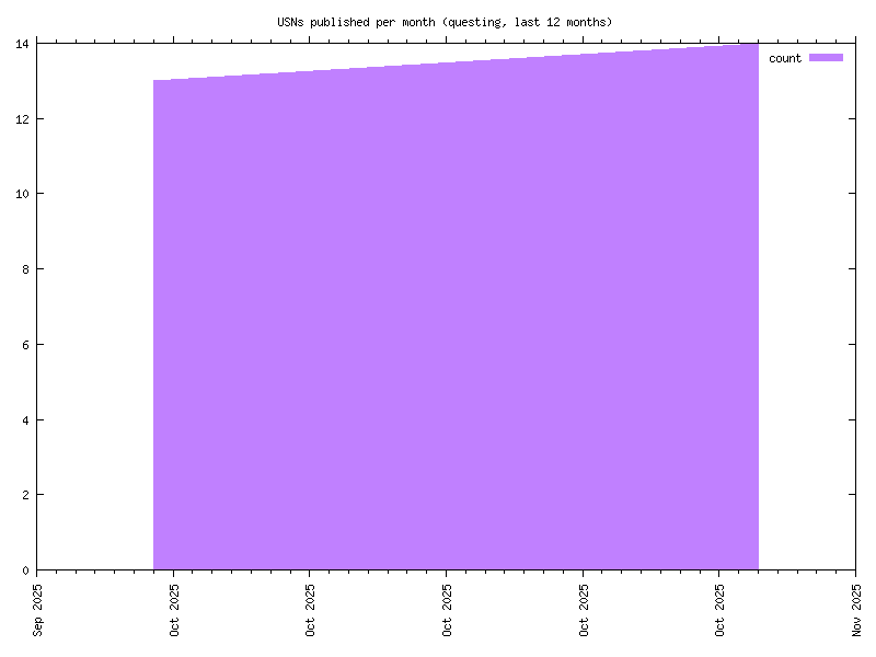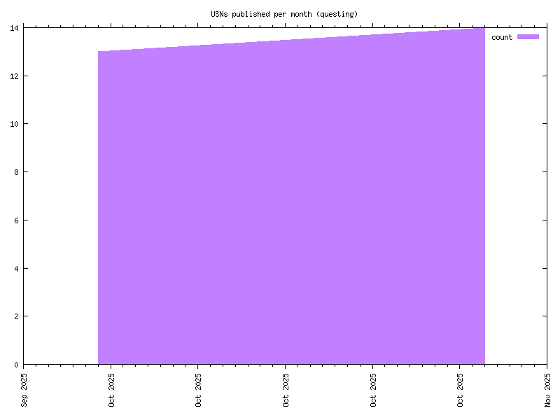| USNs published per month | Ubuntu 24.10 | Graph (r, p) | Graph (r, p) | Ubuntu 23.10 | Graph (r, p) | Graph (r, p) | Ubuntu 23.04 | Graph (r, p) | Graph (r, p) | Ubuntu 22.10 | Graph (r, p) | Graph (r, p) | Ubuntu 21.10 | Graph (r, p) | Graph (r, p) | Ubuntu 21.04 | Graph (r, p) | Graph (r, p) | Ubuntu 20.10 | Graph (r, p) | Graph (r, p) | Ubuntu 20.04 lts | Graph (r, p) | Graph (r, p) | Ubuntu 19.10 | Graph (r, p) | Graph (r, p) | Ubuntu 19.04 | Graph (r, p) | Graph (r, p) | Ubuntu 18.10 | Graph (r, p) | Graph (r, p) | Ubuntu 18.04 lts | Graph (r, p) | Graph (r, p) | Ubuntu 17.10 | Graph (r, p) | Graph (r, p) | Ubuntu 17.04 | Graph (r, p) | Graph (r, p) | Ubuntu 16.10 | Graph (r, p) | Graph (r, p) | Ubuntu 16.04 lts | Graph (r, p) | Graph (r, p) | Ubuntu 15.10 | Graph (r, p) | Graph (r, p) | Ubuntu 15.04 | Graph (r, p) | Graph (r, p) | Ubuntu 14.10 | Graph (r, p) | Graph (r, p) | Ubuntu 14.04 lts | Graph (r, p) | Graph (r, p) | Ubuntu 13.10 | Graph (r, p) | Graph (r, p) | Ubuntu 13.04 | Graph (r, p) | Graph (r, p) | Ubuntu 12.10 | Graph (r, p) | Graph (r, p) | Ubuntu 12.04 lts | Graph (r, p) | Graph (r, p) | Ubuntu 11.10 | Graph (r, p) | Graph (r, p) | Ubuntu 11.04 | Graph (r, p) | Graph (r, p) | Ubuntu 10.10 | Graph (r, p) | Graph (r, p) | Ubuntu 10.04 lts | Graph (r, p) | Graph (r, p) | Ubuntu 9.10 | Graph (r, p) | Graph (r, p) | Ubuntu 9.04 | Graph (r, p) | Graph (r, p) | Ubuntu 8.10 | Graph (r, p) | Graph (r, p) | Ubuntu 8.04 lts | Graph (r, p) | Graph (r, p) | Ubuntu 7.10 | Graph (r, p) | Graph (r, p) | Ubuntu 7.04 | Graph (r, p) | Graph (r, p) | Ubuntu 6.10 | Graph (r, p) | Graph (r, p) | Ubuntu 6.06 lts | Graph (r, p) | Graph (r, p) | Ubuntu 5.10 | Graph (r, p) | Graph (r, p) | Ubuntu 5.04 | Graph (r, p) | Graph (r, p) | Ubuntu 4.10 | Graph (r, p) | Graph (r, p) |